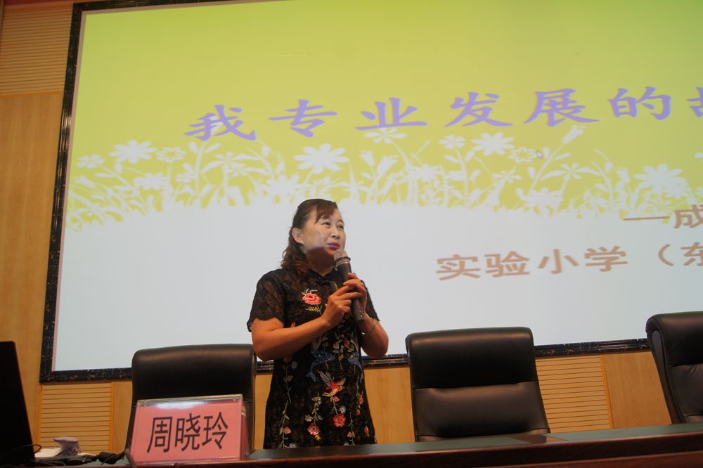 开班典礼后,实验小学东区校长、中小学正高级教师、四川省特级教师周晓玲给在座的新教师们做了《我的教师专业发展故事》专题讲座。周老师用了三个词语概括她的教育经历。一是“热爱”。从周老师饱含深情的叙述中,我们可以感受到周老师始终保持着对教育纯粹深厚的爱。二是“勤奋”。周老师告诉大家,勤奋是取得教育成功的不二法门。精心备好每一堂课,结合学生实际调整教材,甚至自编教材可以更好地对学生进行教育和引导。除此之外,课余时间广泛的学习、海量的阅读、恒久的反思,都是教师走向成功教育的必备条件。三是“研究”。周老师说她在一线教学20多年一直致力于对学生学习和成长的思考和研究,基于此形成了独树一帜的“情智相融”的教育风格,全都归功于持之以恒的教育教学研究。她殷切的希望,新教师们也能树立研究意识,做学者型教师。