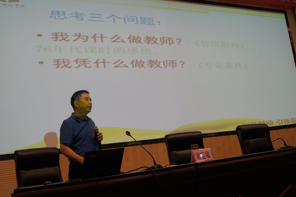 26日上午,双流研培中心副主任、成都市优秀教师谢祖福为新教师们做了《立德树人,从我做起》的专题讲座。谢主任引经据典,给新教师们讲述了教师职业从新中国建立以来的发展与变化,告诉老师们生正逢时迎来了教育的大发展时期。谢主任还结合自身从教经历,为新教师立德树人指明了方向,提出了“克制自己,积极进取,习惯良好,优化心态,注意细节,明辨是非”等建议。虽然谢老师年过花甲了,但是依旧执着的深耕在教育的土地里,“即使出走半生,归来仍旧是少年”是谢老师的真实写照。