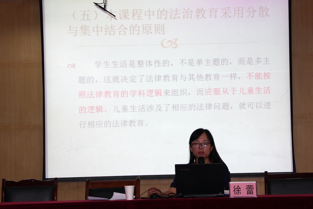 接下来由四川省教育科学研究所小学道德与法治教研员徐蕾老师为我们带来了《统编小学道德与法治教科书编写理念与实施建议》的讲座。徐老师从编写背景情况介绍、如何理解小学道德与法治课程、教材编写的指导思想、教材的整体结构、本教材的特点、具体内容涉及的教育思想、如何用好道德与法治教材等方面进行了详细的讲解,让参会老师对于本套教材有了宏观的认识。