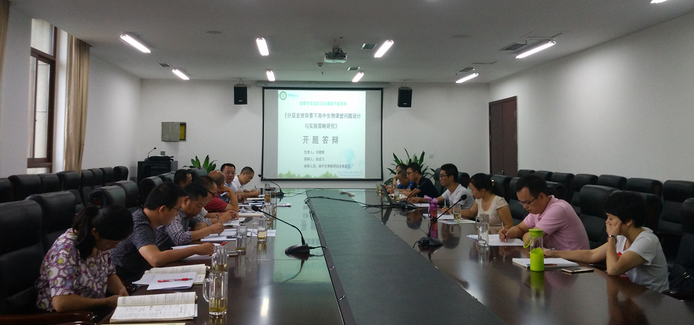 2017年9月8日上午,双流区区级课题《分层走班背景下高中生物课堂问题设计与实施策略研究》开题答辩在棠湖中学顺利开展,市生物教研员郑大钊老师、区研培中心理论室杨独明老师、区生物教研员杜尚兵老师、学导处副主任廖勤生、以及课题组全体成员参与了此次开题答辩活动。