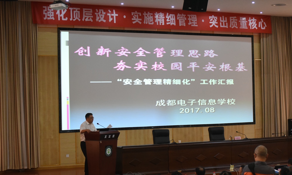 在安全管理精细化经验交流中,成都电子信息学校校长刘代贵作了《创新安全管理思路,夯实校园平安根基》的专题交流,东升一中校长熊波作了《实施安全精细管理,共建平安和谐校园》的专题发言。