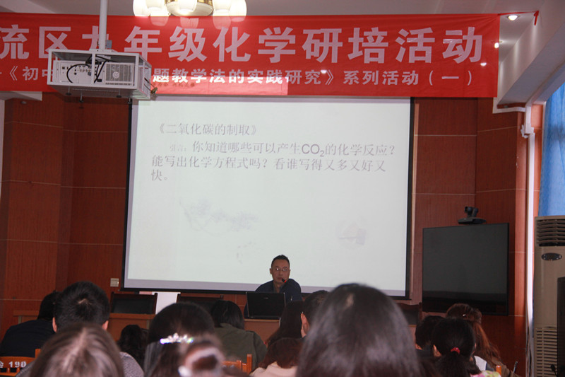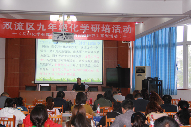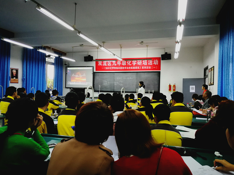 10月10日上午双流区九年级化学十月研培活动在黄龙溪学校进行,此次研培活动也是《初中化学有效问题教学法的实践研究》系列活动之一。全区的九年级化学老师和课题组全体成员到会参与。