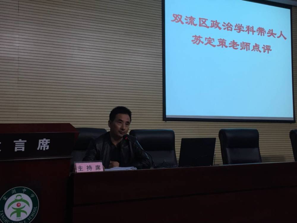 随后,全体与会老师在第二阶梯教室进行了展示课后的点评讨论和“选课走班 ”的主题交流。高二政治组张雪梅、孟霞和李潘东三位老师分别就不同层次教学班级的教学设计和课堂教学实施的思路进行了说明,就其中关于不同层次班级的学情分析、探究问题设置等关键问题进行了具体分析。双流区政治学科带头人苏定策老师就四位老师的教学设计和课堂教学进行了点评,高度肯定了棠湖中学高二政治组在着力培养学科核心素养、深入把握“三段”教学和积极实践分层教学 方面的努力和成效。棠中高二政治备课组组长谭亚琼老师就参加培训的老师们最关心的“选课走班”背景下的教学实施与管理等问题进行了交流分享,她既从理论上说明了我校的制度设计和创新,又在具体操作中展示了本校政治组的成功经验。在观摩展示课和聆听棠中老师的分享后,来自成都全市十余所高中的参训教师纷纷表示获益匪浅,对棠湖中学的优秀经验要认真研究,对双流区政治学科新课改给予了高度评价。