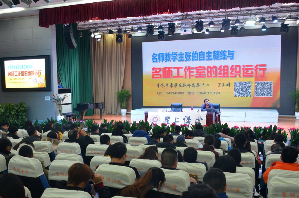 最后丁校长给大家介绍了南京市的名师工作室建设。他从名师工作室的发展定位、建设目标、研究内容、成员定位、组织运营等方面同大家分享了自己的看法和经验。