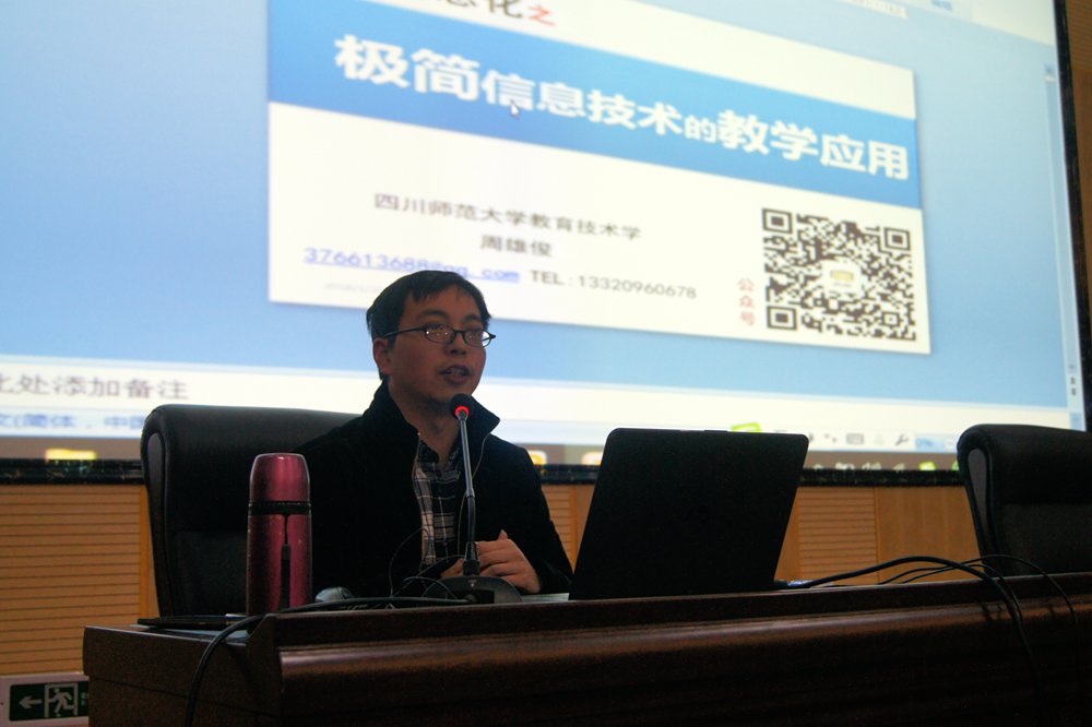 上午9时,四川师范大学教授周雄俊为全体新学员作了题为《极简信息技术的教学应用》的专题讲座。我区2017年新教师培训班351名学员认真聆听了周教授的专题讲座。周教授主要介绍了信息技术的工具性应用、信息化教学的环境构建和个性化教学资源的支持等方面的内容。在介绍信息技术工具时周教授指出,我们要利用先进的工具提升我们的教学效率,同时先进的工具要有正确的使用方法才能提高效率。他给大家推荐了常用的教学软件并进行了现场的操作指导。在讲座中他还给大家推荐了大量的信息技术资源网站。
