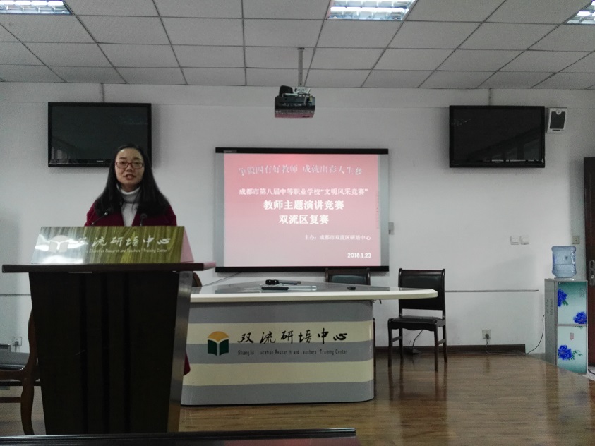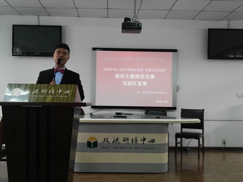 为全面贯彻党的十九大精神,落实立德树人根本任务,通过 文化育人、活动育人、实践育人促进中等职业学校校园文化建设, 充分展示中等职业学校师生文明风采。2018年1月23日,成都市第八届中等职业学校“文明风采大赛”教师主题演讲比赛(双流区复赛)在研培中心举行,来自全区六所中等职业学校的10余名老师参加了比赛。