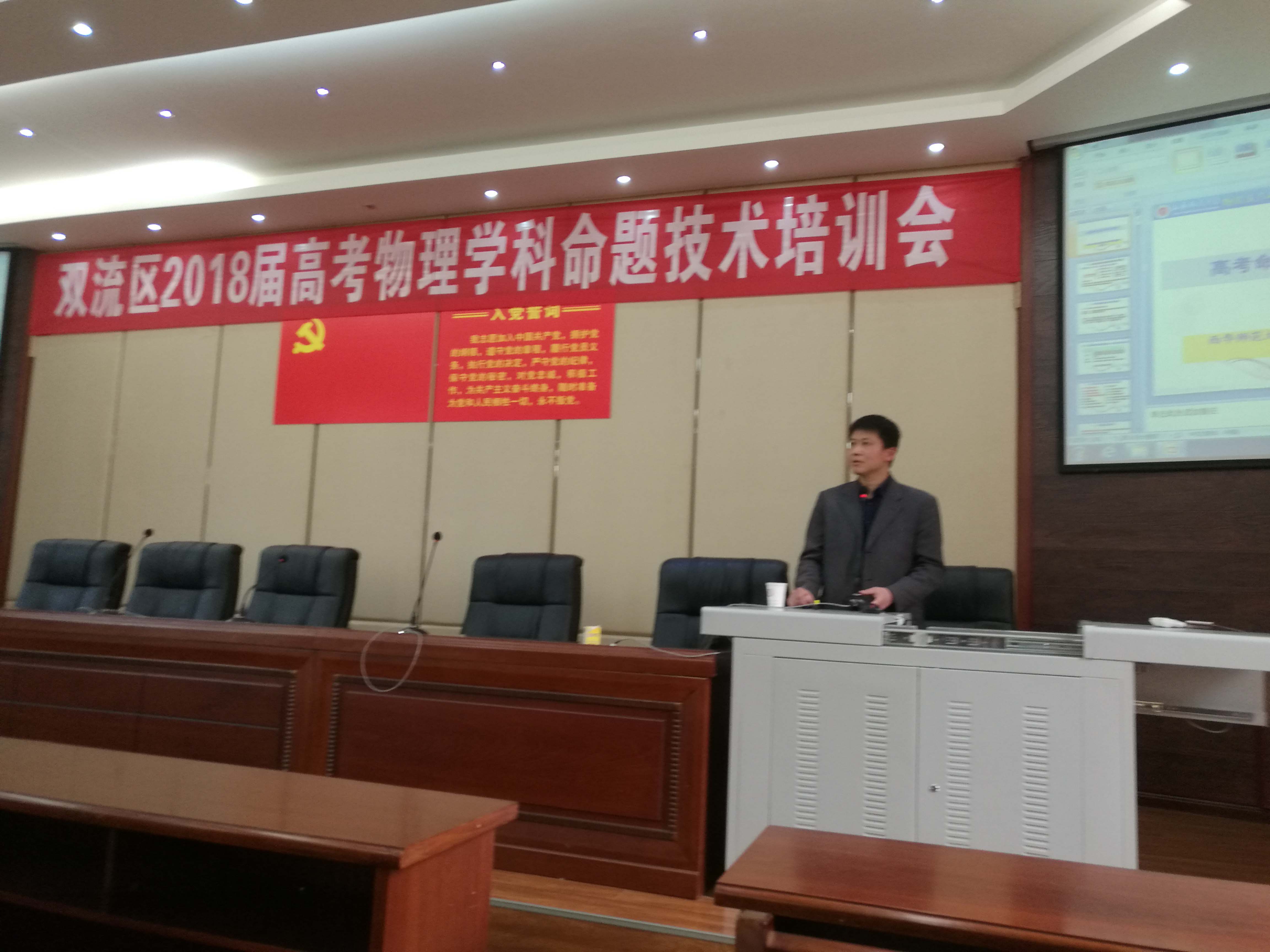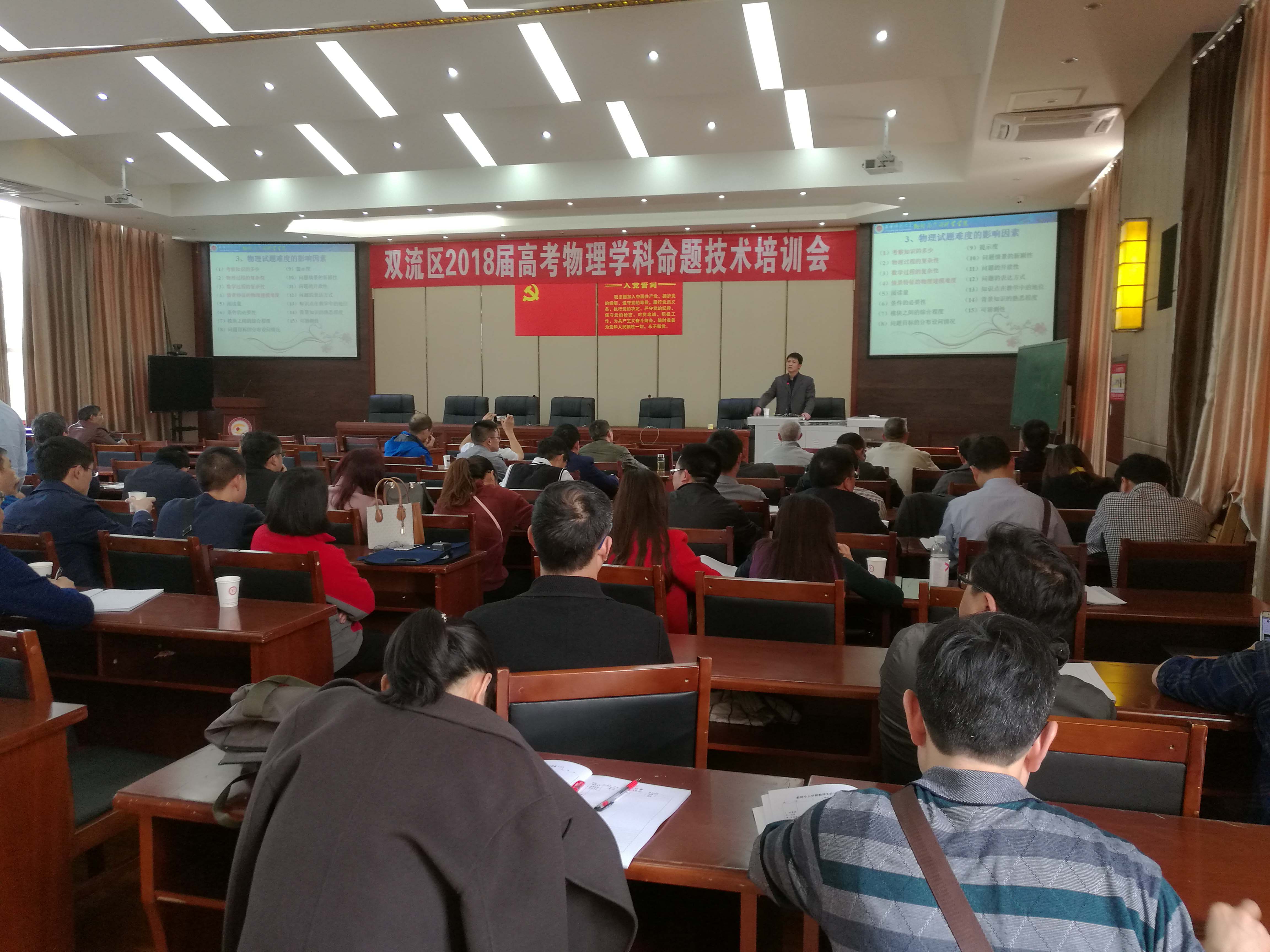 根据双流区教育局“关于做好新课程高考模拟试卷命制的主题研修暨第三届高考模拟试题命题竞赛活动的通知”要求,2018年3月15日,双流区物理学科高考命题技术专项培训活动在成都棠湖外国语学校举行。会议由双流区研培员滕刚老师主持,双流区全体高中物理教师及清白江、广汉的部分教师参加了本次培训。