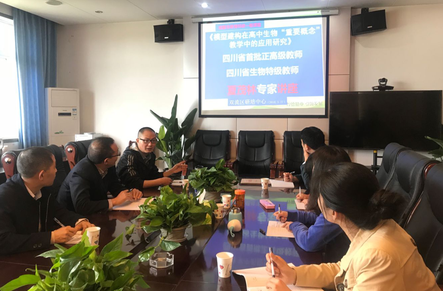 2018年3月27日,成都市教育科研一般课题:“模型构建在高中生物重要概念教学中的应用研究”中期推进活动在双流区研培中心三楼会议室成功进行。除该课题组全体成员参加了活动外,课题指导专家团队中的四川省正高级教师、省生物特级教师夏茂林老师也进行了专题的指导和讲座。本次活动由课题负责人区研培中心生物研培员杜尚兵老师主持。