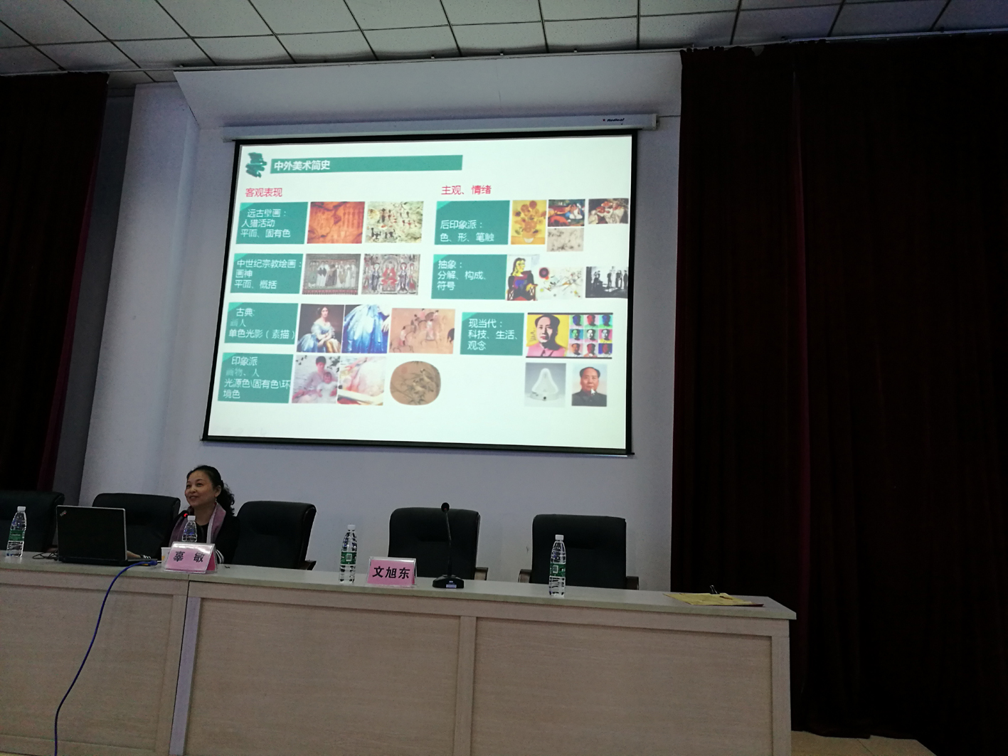 一、中外美术简史。辜老师从“客观表现”和“主观、情绪”两条线对美术史进行了简要的分类和梳理,总结出科学的发展决定了艺术的每一次大变革,引导老师们从新的角度对中外美术简史进行了重新的认识,拓宽了老师们的思维,引发了老师们对未来美术教育教学的思考,更为老师们提供了学习方法和研究方法上的指导。