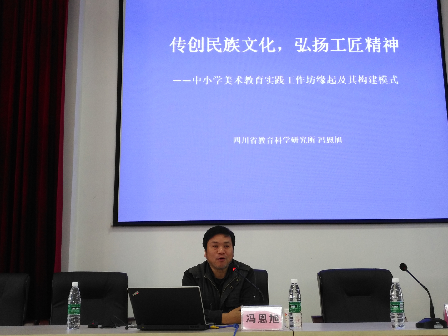 上午9点至12点,四川省教育科学研究院艺体所所长兼美术教研员、中国美术家协会会员、正高级教师冯恩旭先生为大家作了题为《传创民族文化,弘扬工匠精神——中小学美术教育实践工作坊缘起及其建构模式》的专题讲座,如一缕阳光般温暖着老师们的心灵,使老师们收获颇丰。此次讲座主要包括以下几个方面的内容: