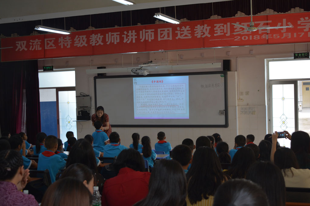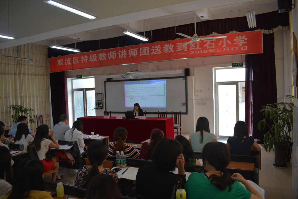 2018年5月17日上午,“双流区特级教师讲师团送教到红石小学”活动在红石小学成功举行。区教育局小教科科长罗丽,双流区研培中心发展室主任赵剑云,小教室主任冯之刚,研培员付建勇、李晓玉,成都市学科带头人、双流区名教师工作室导师罗莉及其学员,以及全区各学校的教师代表参加了本次活动。