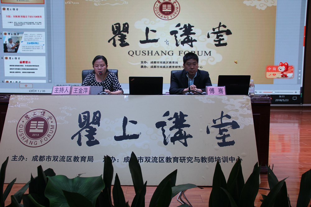 2018年5月23日上午,双流教育“瞿上讲堂”第二十六次讲座在棠湖小学多功能厅顺利举行。北京师范大学教育学部副教授、硕士生导师,教育技术学院副院长,开源创客工具Mixly及MixIO研发团队负责人傅骞博士为大家作了题为《创客教育理念下的STEM教育》的专题报告。双流区各公办学校、全日制学历教育的民办学校分管教学副校长、教务主任、信息技术教师和科创教师,公办幼儿园科研(师训)部门负责人,名教师工作室、名班主任工作室、名校长工作室导师和学员,区研培中心全体研培员,青白江、乐至县和简阳市学校教师代表共计500余人聆听了讲座。双流区教育局副局长王金萍主持了会议。