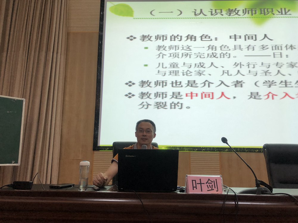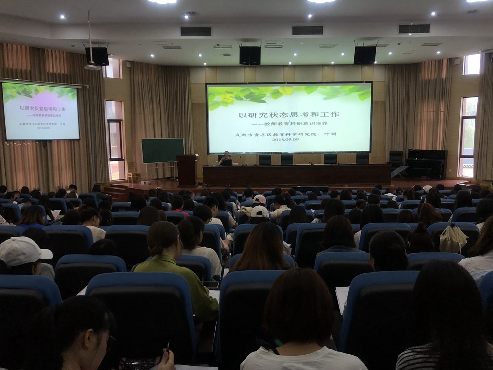 9月9日上午9点,成都市青羊区教科院科研室主任、成都市教育学会基础教育课程改革专委会副主任、成都市教育改革与发展委员会理事叶剑为大家作题为“以研究状态思考和工作——教师科研意识培养”的专题讲座。整个专题讲座,叶主任循序渐进,用丰富的案例带领新教师们从认识教师的职业角色、职业特点上引出了教育科研的重要性,并从“区域教改环境”、“评优晋级硬件”、“教师专业成长路径”、“关于PCK”、“教师成长规律”以及“职业幸福感”六个方面有针对性地剖析了原因。接着叶主任带领大家重新认识了教育科研,并且深入浅出的讲解了教育的研究状态、指标、工作方式、研究问题的来源、研究的思维方式等。鼓励新老师们带着研究状态思考和工作,让研究成为工作理念。最后他向所有的新教师送出了“课为纸、校为册、行作笔、心当墨”的美好愿景和期待。