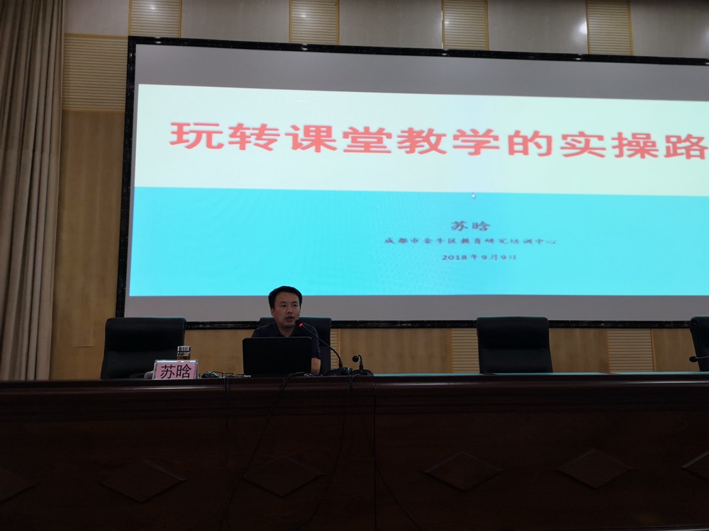 9月9日下午13点30分,四川省成都市金牛区教育研究培训中心小学部主任、成都市教育科研先进个人苏晗为大家作了题为“有料、有序、有趣、有探、有效——让学生玩转课堂的实操路径”的专题讲座。苏主任首先就两个课堂教学案例与在场的新教师展开互动交流,引出了讲座的主要内容——“玩转课堂教学的实操路径:有料、有序、有趣、有探、有效”。接着从常态课堂教学中出现最多的问题,在教师和学生两方面总结出原因。提出破解的方法就是“了解教师专业发展的成长秘密”,学习已有的经验是教师发展过程中必然经过的一个重要步骤。然后他例举了杜郎口中学、清浦一中、可汗学院、颠倒课堂等多个教学实例,引出大家对玩转课堂教学的思考,提出要实现玩转课堂教学不仅需要理念作基石,更需要技术的支持。最后从3.0版本的课堂教学改革,明确新教师需要发展完善的方向。并对“高阶思维”、“深度学习”、“人工智能”三个热点问题再次与在场的新教师们展开互动交流,新教师们纷纷表达自己的见解和看法,最后得出玩转课堂的终极技术是对学生的爱!