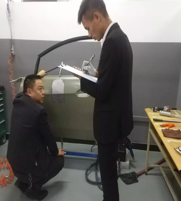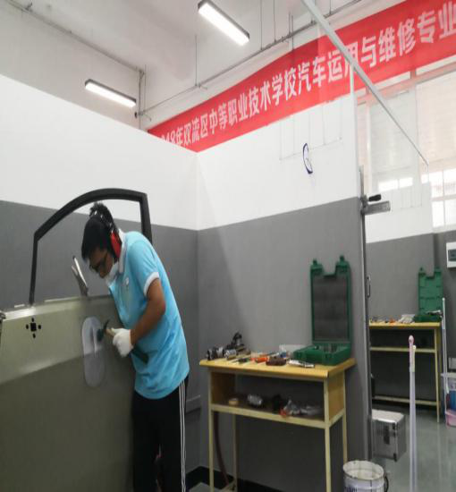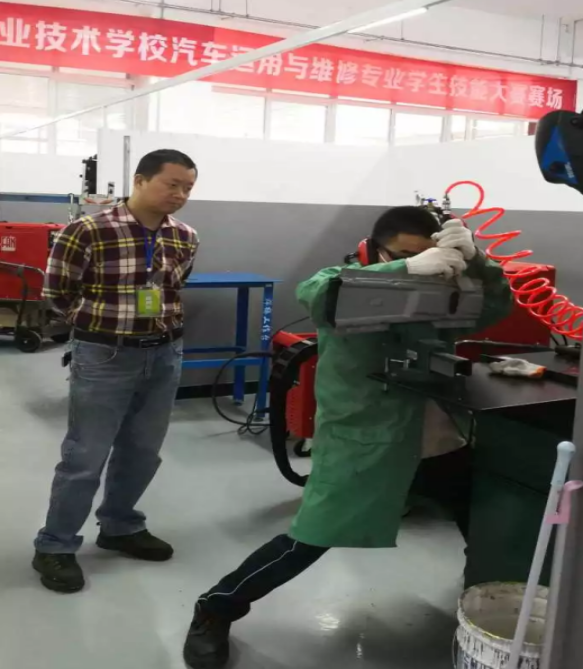 本次竞赛项目为:车身修复(钣金),分为“板件更换”、“受损门板修复”两个子项目,双流区开设汽修专业的中职学校各派出了一支参赛队(2人/队)参加了本次比赛。