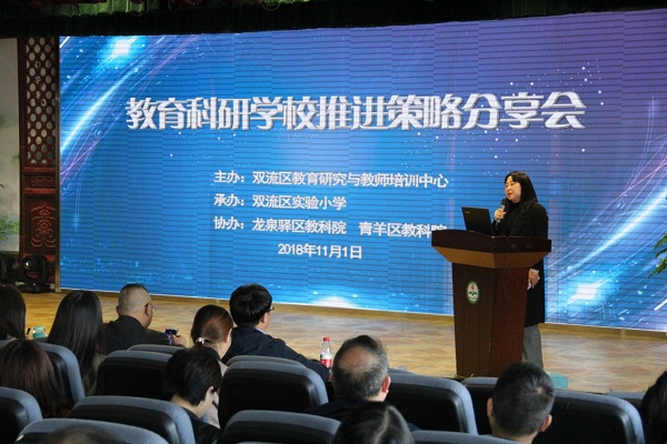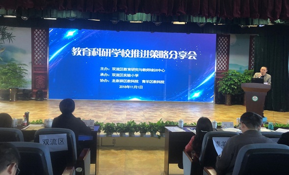 2018年11月1日,由双流区研培中心主办,龙泉驿区教科院和青羊区教科院协办的“教育科研学校推进策略分享会”在双流区实验小学举行。来自双流区、龙泉驿区、青羊区,以及简阳市、天府新区各学校科研室主任及科研骨干教师共180人参加了为期半天的活动。