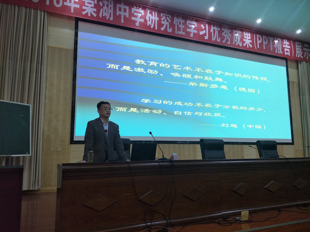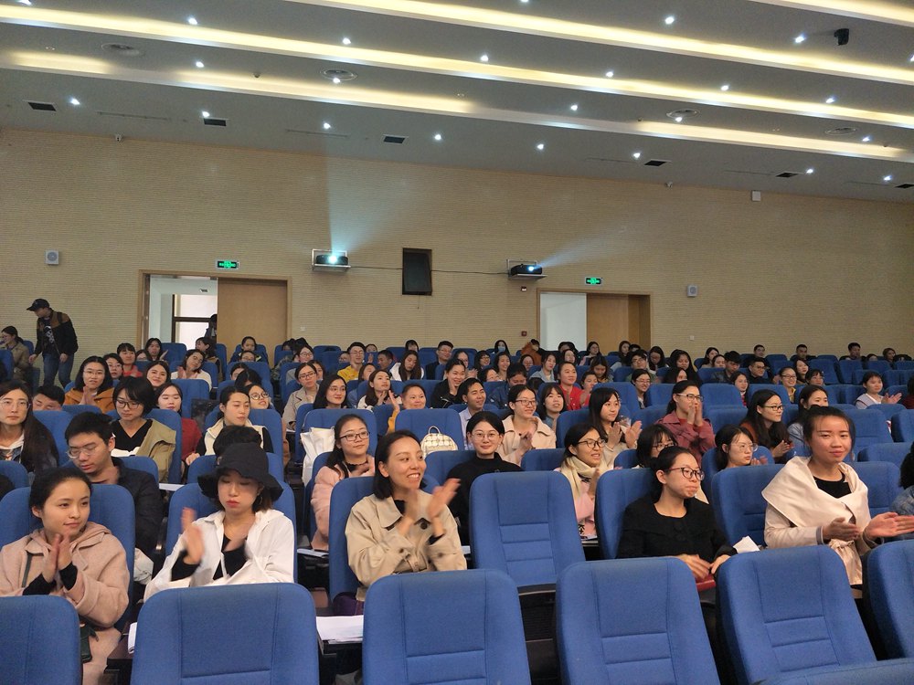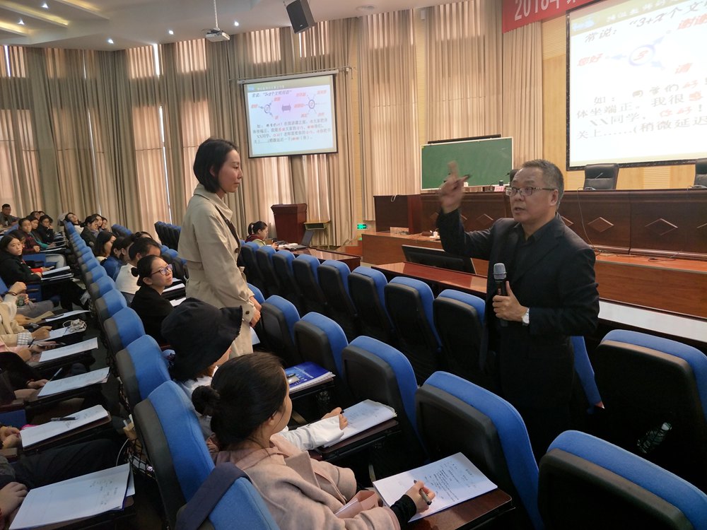 刘老师首先提出几个来自课堂的问题思考,然后通过丰富有趣的教学实例告诉老师们怎样备课、怎样上课。让我们了解到怎样调动学生情感、引导学生思维与动手、培养学生自主有效地获取知识和能力。他引用大量教学中的真实案例向老师们传授了“教”的方法与策略:有自己的教学目标、学习目标,善于研究教材、分析学生、研究学法;还要在教学过程中巧妙地引入艺术。教学设计,不只是知识本身的传递与浇灌,其目的是为了学生的学,而不是为了教师的教。期间,刘老师与老师们愉快地分享交流,他用幽默的语言,生动的事例带领大家在课堂艺术的殿堂中行走,现场不时欢声笑语,掌声响起。