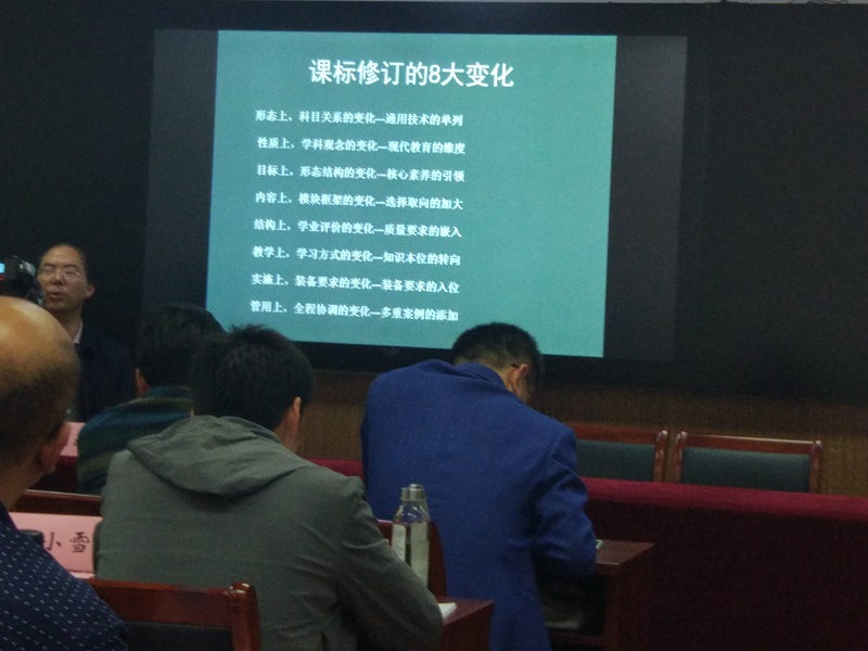 10月23日上午8:30培训正式开始,简短的开班仪式与合影留念后,南京师范大学教育科学学院博士生导师顾建军教授做了两个专题讲座,分别是《普通高中技术课程标准实验十年来的成就与问题和《普通高中通用技术课程标准修订稿解读》