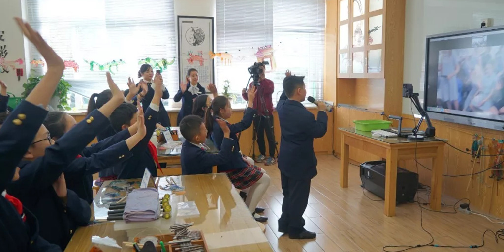 (七)圣菲小学王茂萍、祝佳两位老师共同执教的《蜀韵融合课程蜀人李冰治水-皮影》课堂教学转播现场
