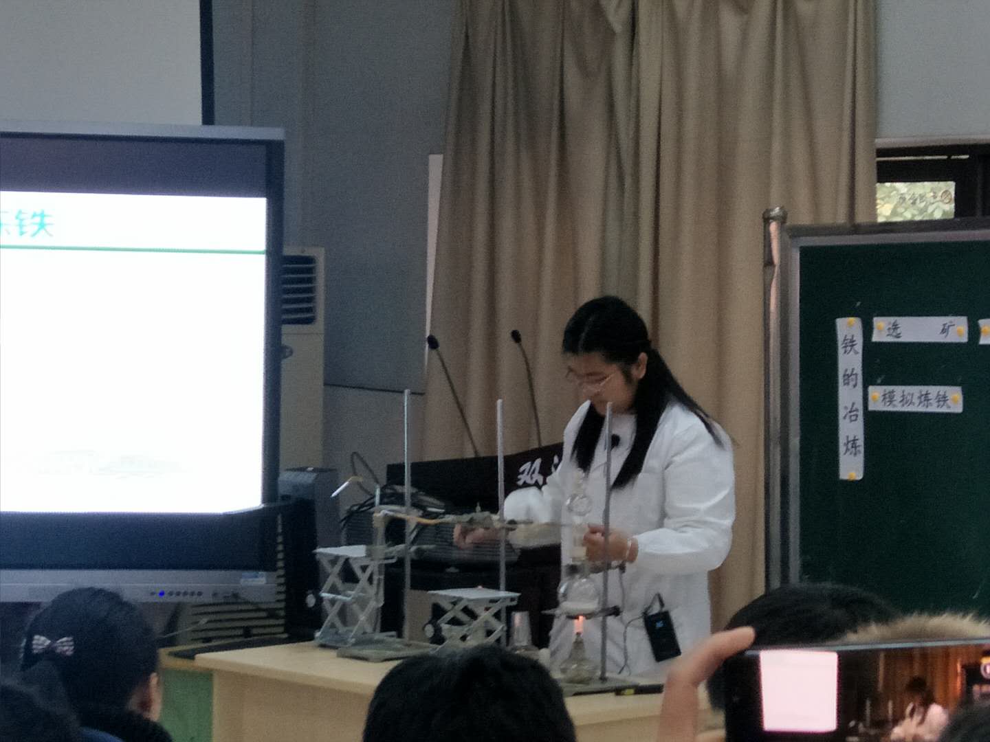 第一节课,棠湖中学的罗晗老师精心准备,以颜料的秘密为情境带领学生们进入了本节课的学习,从而引出矿石的形成。并展示几张含铁的矿石让学生从含铁量分析,选用哪种铁矿来炼铁。最终以赤铁矿为例,为学生讲授了工业和实验室炼铁的原理和操作。罗老师将实验室炼铁的仪器和药品带到课堂给学生展示实验室炼铁的流程,突破学生对一氧化碳有毒危险的恐惧,带给学生真观实感。并以此将整堂课进行了升华。
