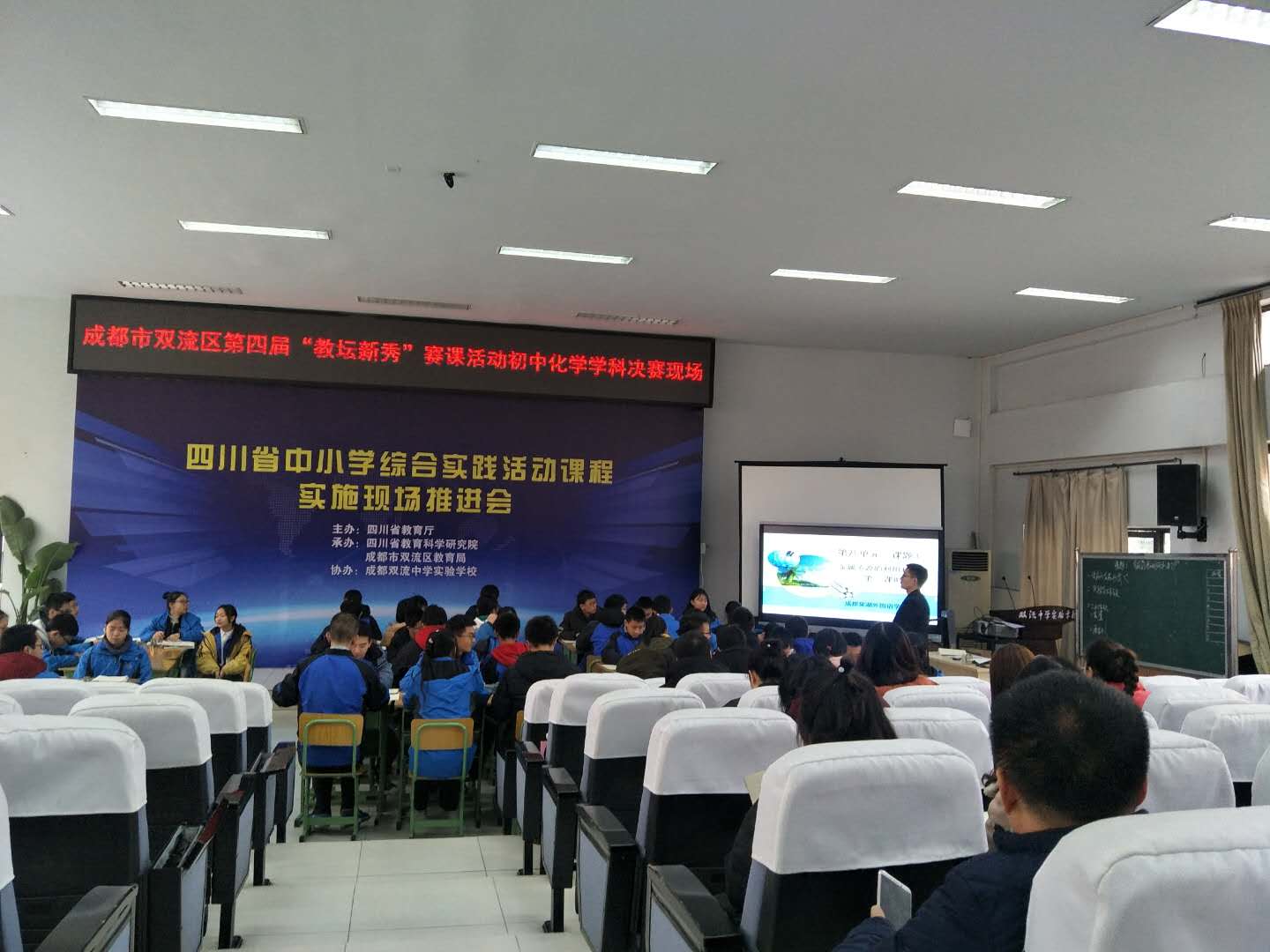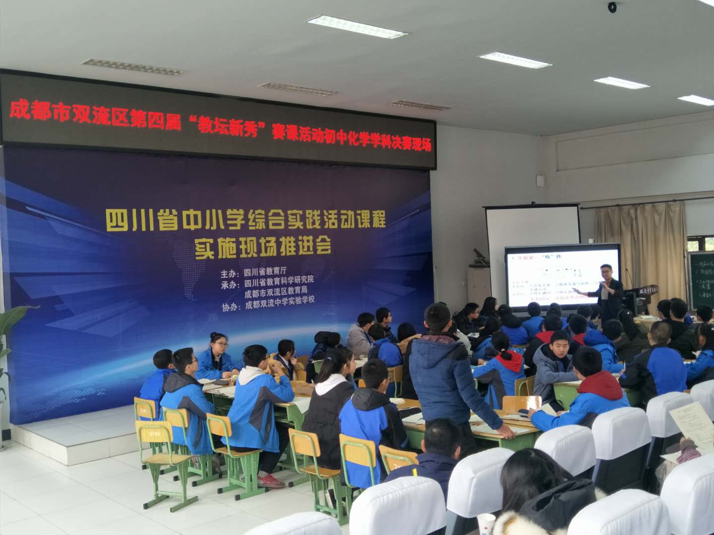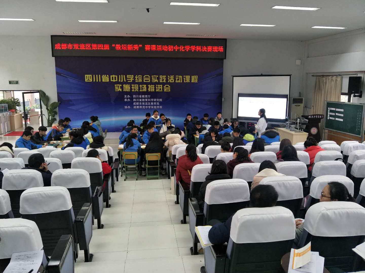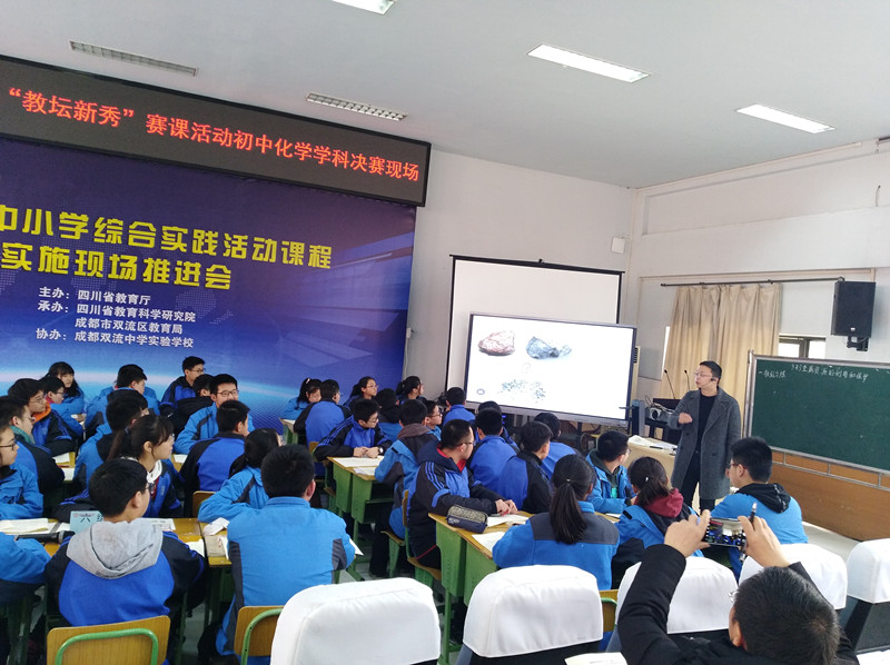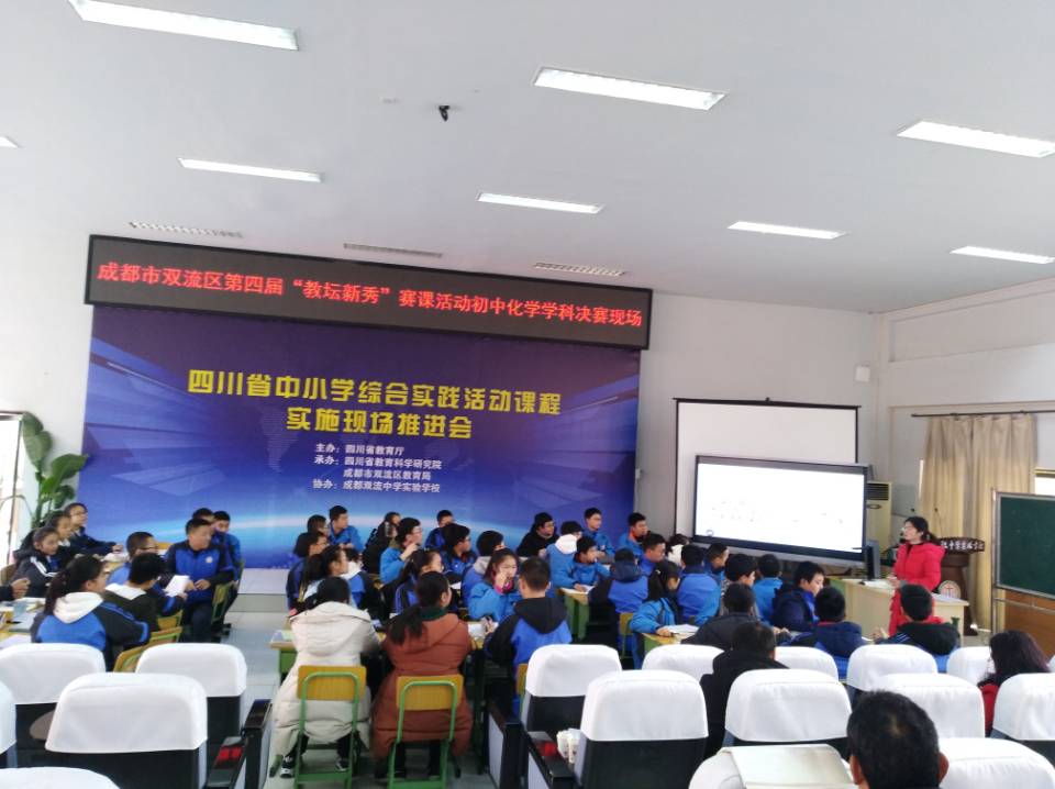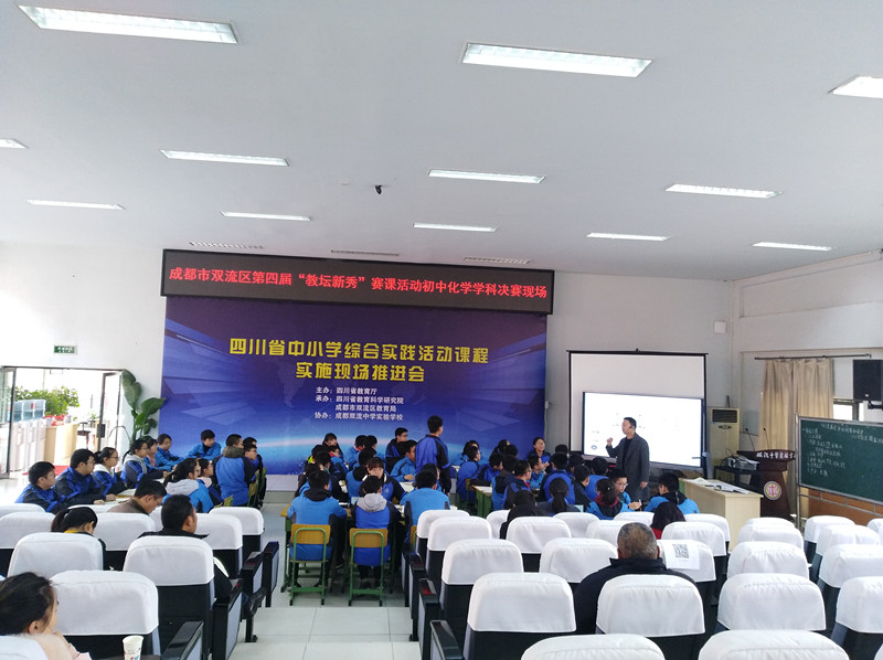 2018年12月18日,双流区第四届“教坛新秀”赛课活动初中化学学科决赛在双流中学实验学校举行,并获得圆满成功。来自棠湖中学、棠湖中学实验学校、成都棠湖外国语学校、双流中学实验学校、黄龙溪学校的五位年轻老师参加此次比赛,全区的初中化学教师到场观摩。为保证比赛的公平公正,选择了大家都没有上过的课题进行比赛,提前一天抽签决定上课顺序。