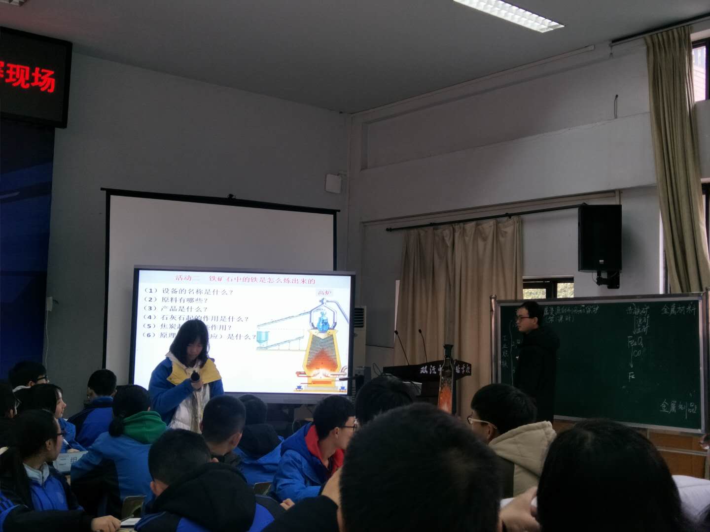 第四节课,双中实验校的李雄老师,围绕炼铁厂的各种活动开展教学,带领学生走进炼铁厂了解常见的铁矿石,讨论不同还原剂用于炼铁的优缺点、观看工业炼铁的视频、明确高炉内发生的主要反应;走进实验室;角色扮演,你来当厂长,计算冶炼一定质量的生铁需要铁矿石的质量。