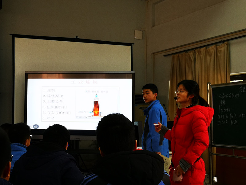 第三节课,棠外的何坤老师从金属制品在生活中的广泛应用进入课题,通过介绍金属在自然界中的存在形式,增进了学生对矿物的了解。接着又通过古代炼铁工艺图引导学生在思考和讨论中一起探秘铁的冶炼原理,在和学生一起设计实验进行模拟炼铁的基础上,通过高铝炼铁模型介绍了工业炼铁的流程,并结合实际进行了有关不纯量计算的教学。何老师流畅的教学过程、简练的语言表达和机智的应变能力获得了在场老师的一致好评。