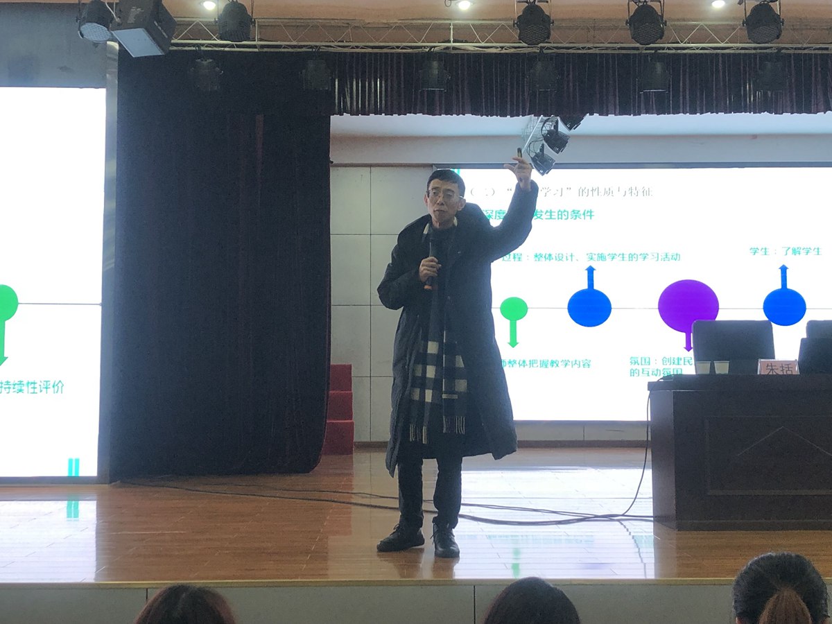 下午1时半,重庆大学、西南大学硕士生导师、田家炳项目基础英语教师培训内地首席专家、区域课程领导力建设核心专家、深度学习英语学科核心专家朱括为大家进行了《深度学习:指向学科核心素养的3.0教学设计》的主题讲座。朱老师首先从我国基础教学的发展引出1.0至3.0版本的课堂教学目标的改革和变化历程。接着针对3.0教学的“深度学习”目标层层递进,引领新教师一起学习何为“深度学习”。接着,他运用自己扎实的理论知识向在座各位老师讲授了“深度学习”的定义、性质、特征以及其要素。还通过生动丰富的案例从理论和实际操作层面讲解了“深度学习”教学设计的原则、基本要求、实际运用和评价方式。最后他向大家分享了三本有关“深度学习”的课堂教学设计的书籍。