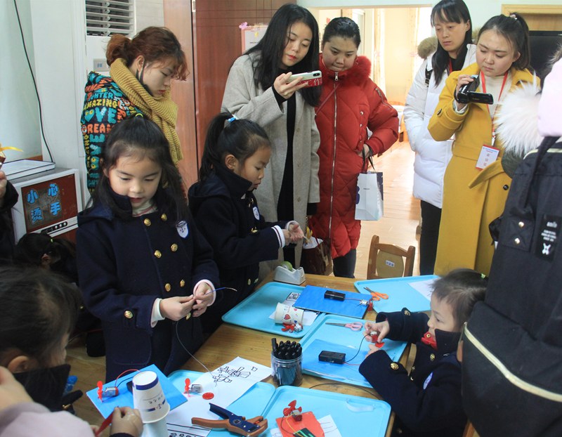 9:20—10:00,与会者走进光电所幼儿园,观看了幼儿园课题研究成果资料:《一起玩科学》系列园本教材、STEM理念下的科技小制作、科学主题探究活动资源包、幼儿园原创科普图画书、玩教具专利产品等。参会教师对幼儿园自主研发的科学玩教具产生浓厚的兴趣,在与玩教具充分互动的过程中感受到科学的魅力,对幼儿园教师的研发能力表示极大的赞叹。