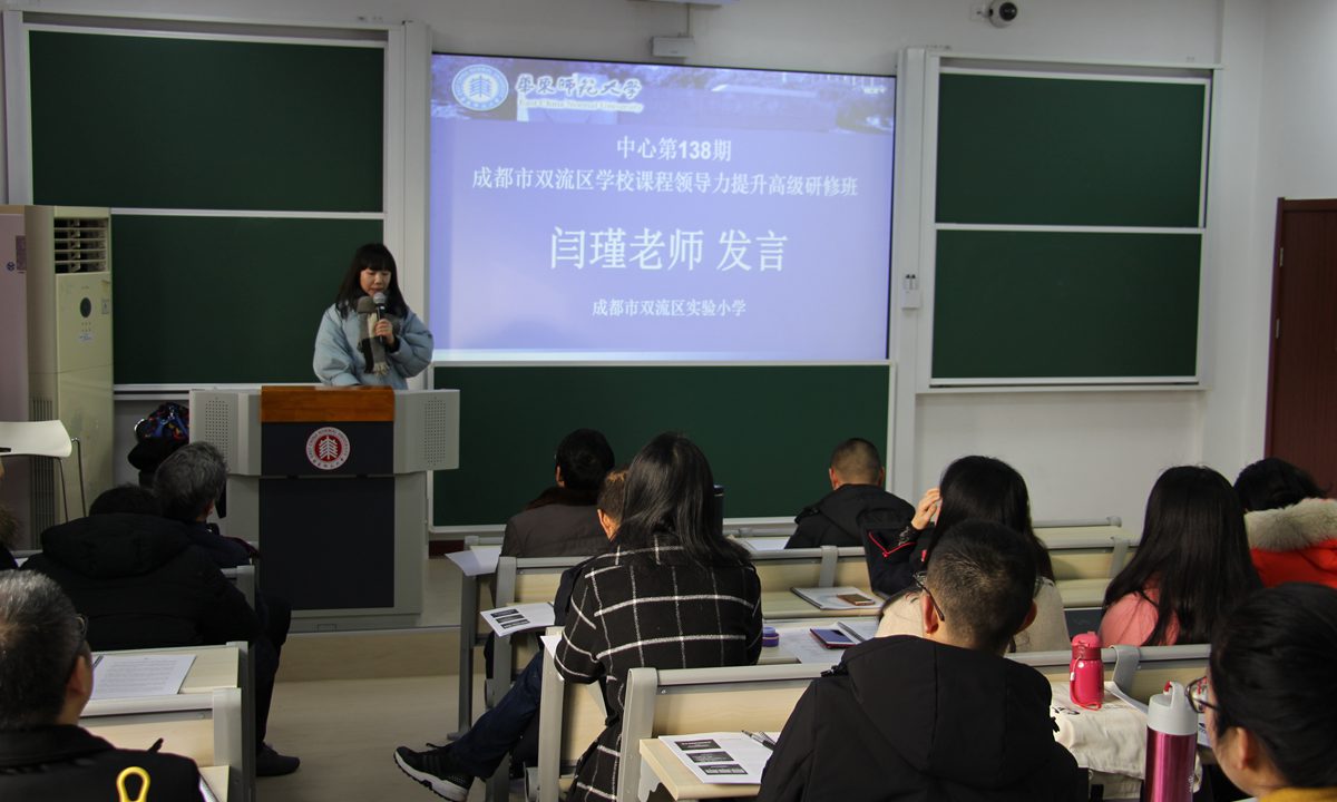 最后,双流区实验小学教务处主任闫瑾代表全体学员发言。她首先感谢华东师范大学课程与教学研究所给大家提供专业的学习平台,感谢双流区教育局、研培中心倾心为大家创造的学习机会,她表态:必将珍惜这次学习机会,认真学习,细心领悟;怀揣空杯心态,清零思想,潜心学习,善思求变;最后祝福每位学员,相伴学习,共同进步。