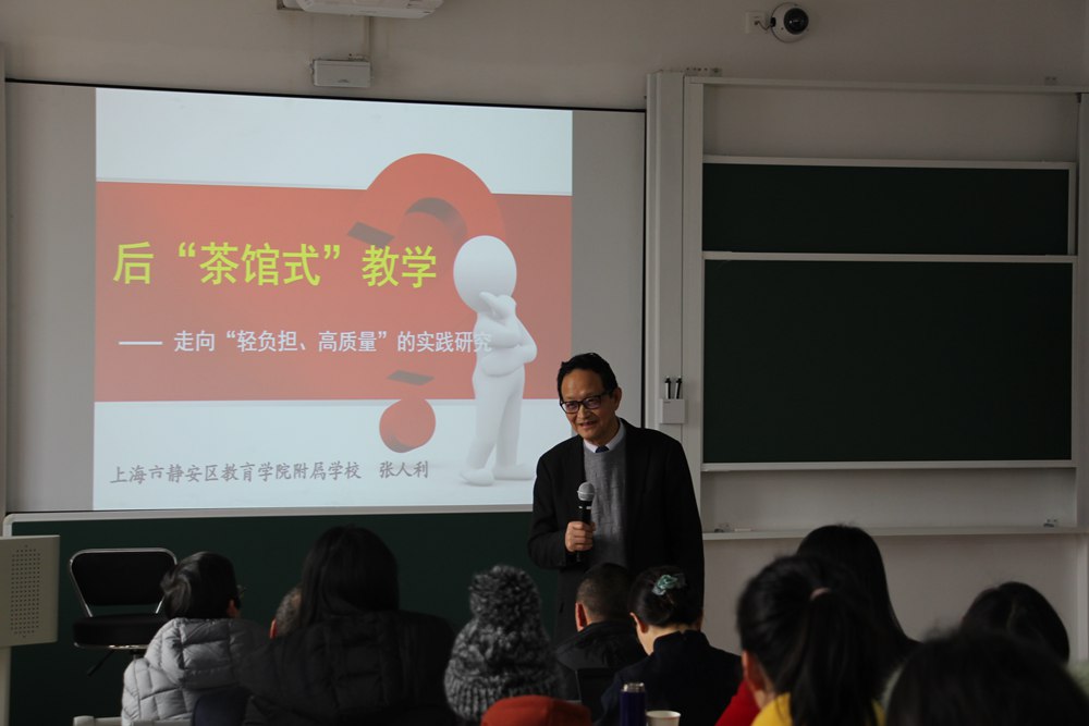 下午,上海市静安区教育学院附属学校校长张人利为我们带来主题为《后“茶馆式”教学---走向“轻负担、高质量”的实践研究》的专题讲座。他从静安区教育学院附属学校通过师资培训和课程建设为内涵的发展之路谈起,从四方面为详细我们作交流。第一,后“茶馆式”教学的产生缘由;第二,后“茶馆式”教学的实践研究;第三,后“茶馆式”教学的成果阐释;第四,后“茶馆式”教学实际效果。张校长强调日常课堂教学的弊端在于没有直落教育核心环节----课堂,而建立后“茶馆式”教学,则促使教学方式更加多元,教学方法更加灵活,教学手段更加现代,从而体现好课堂的基本特性----科学性、社会性、艺术性。