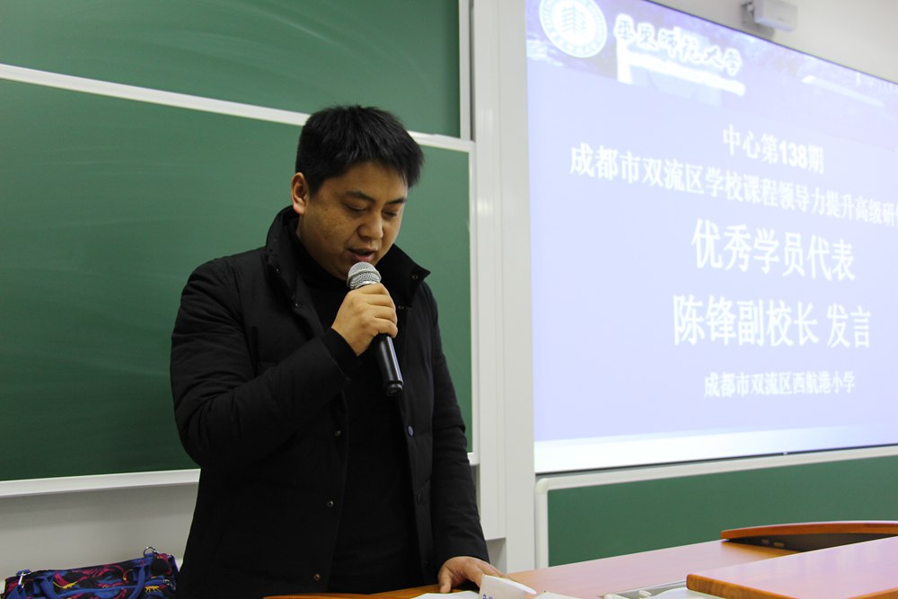 首先,双流区西航港小学副校长陈锋作为集中培训优秀学员代表发言。他代表全体学员感谢双流区教育局、研培中心为大家创造如此珍贵的学习机会,感谢华东师范大学课程与教学研究所给大家提供专业的学习平台,他表示通过这次学习,学员们都有不同的进步,对于核心素养的内涵有了更明确的认识,对于课程纲要的编写也有了清晰的方向。