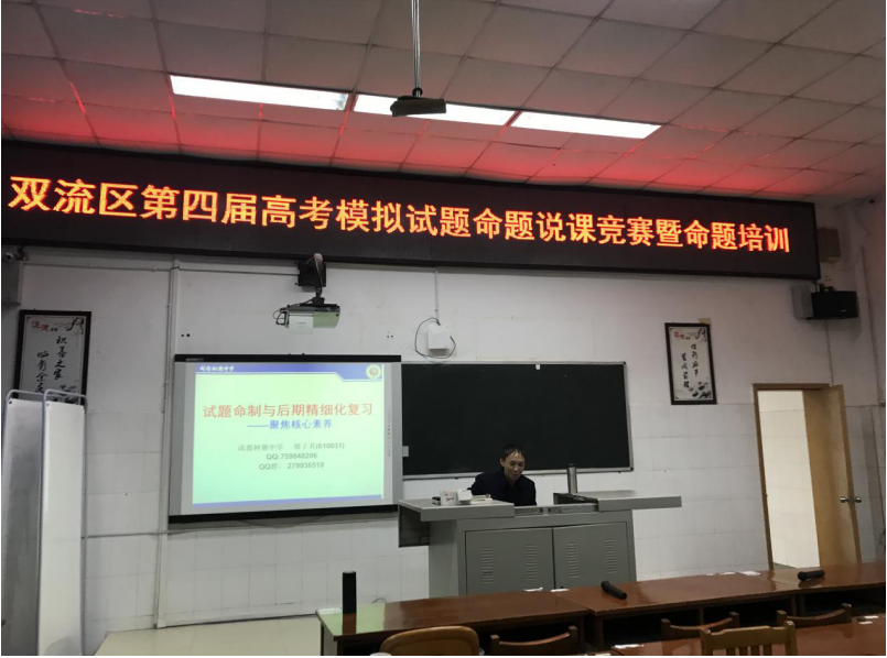 下午1:30开始,郭子其老师为全区教师就试题命制和高三后期复习进行了专题讲座。就学科核心素养背景下高考命题的“变”与“不变”、高考的命题方向、命题的原则、命题方法、命题内容选择等方面进行了充分的讲解和分析;专家们在讲座指导中,还以双流各学校的试题为案例进行了命题、选题、组题、用题、讲题指导;结合自身丰富的经验对参会教师在一线教育教学等方面提出的问题、困惑,同与会教师进行了的互动交流。