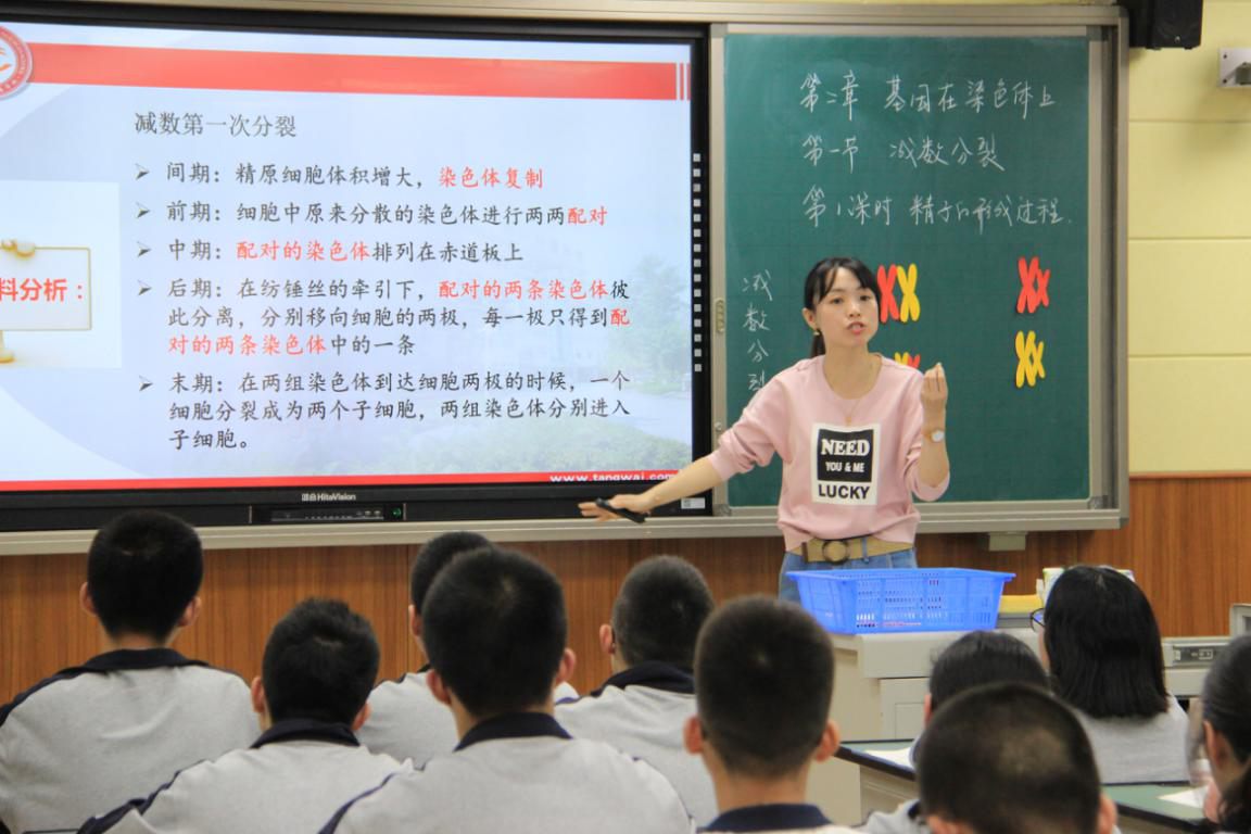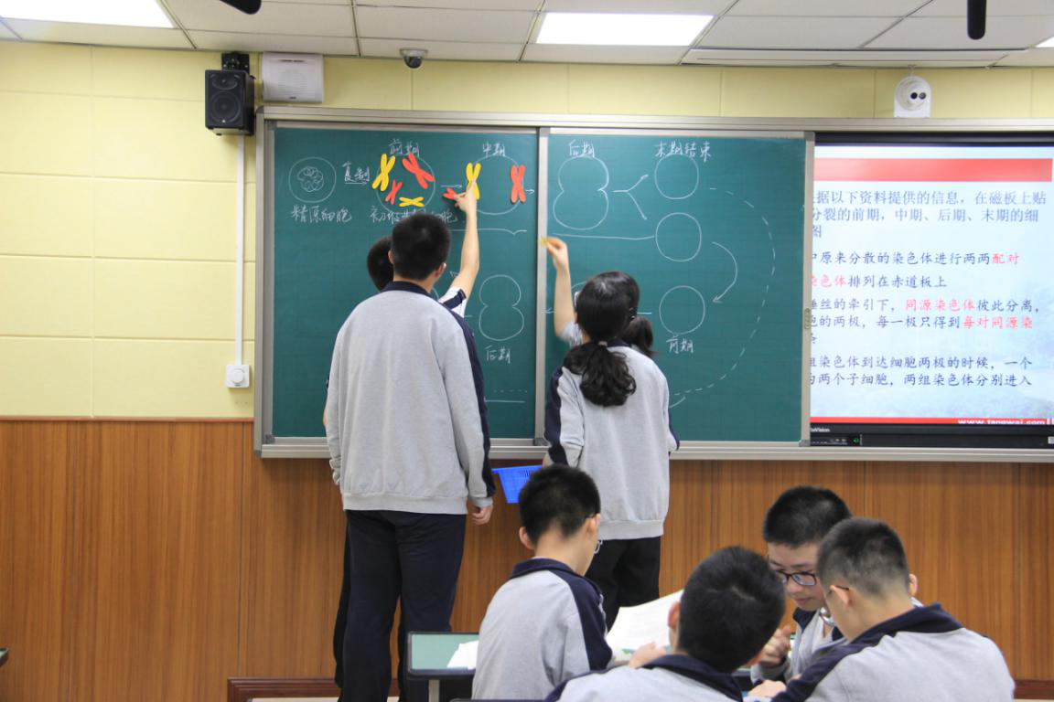 《减数分裂》一直以来都是高中生物学教学的难点,李钰老师使用亲自制作的简易教具模型,提供资料,让学生小组合作摆放染色体的位置,利用模型演示减数分裂的过程,由宏观的过程到细节的探究,由简单到复杂的设计,使学生对于“减数分裂”这一概念理解更加深刻,也为老师们如何攻破这一难点提供了新的思路。