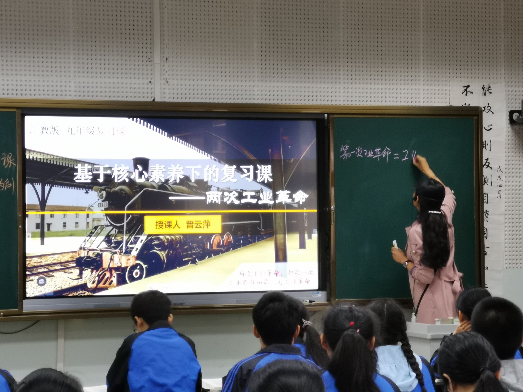 研讨会首先由双中实验学校晋云萍老师为本次研讨会献课,其献课的主题是“核心素养下的初三历史复习”,以两次工业革命为复习线索。为此次献课,晋云萍老师积极筹备,多方查阅资料,深入研读《初中历史课程标准》和《高中历史学科核心素养》,比较近年来成都市中考考点、考题。利用时间轴、知识树、课堂小游戏、典型史料等多种信息技术手段,培养学生的时空观念和史料实证等素养。挖掘两次工业革命重部分科学家人格要素,引用阿克莱特和瓦特人物故事,科学家们坚持、创新的品格影响了学生,春风化雨,润物无声中对学生进行健全人格教育。通过对比东西方在工业革命前后的发展进程,让学生理解了为什么落后就要挨打,为什么当今我国要深化改革和鼓励创新,培养学生历史理解。