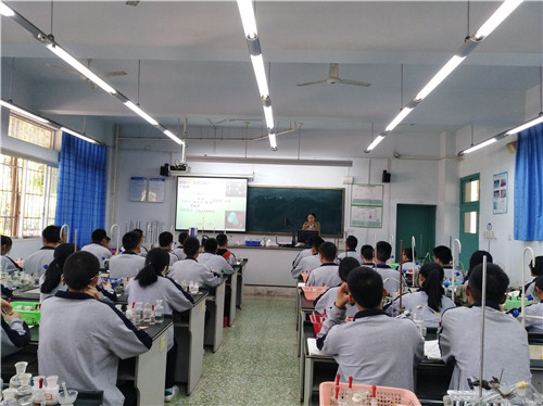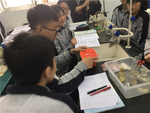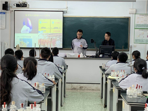 高中上午两节课为必修2《化学反应与能量》的新授课。双流中学的胡洋溯老师,在课前布置学习任务,查阅资料收集人类利用能源的知识,做“化学新课每日一读”,动手做环保杯。课中通过情景创设、实验感受、理论探析、应用提升四个环节开展教学活动,学生通过多种学习方式感受到化学反应中的能量变化,了解了常见的吸热反应和放热反应,并能从微观实质上进行分析。