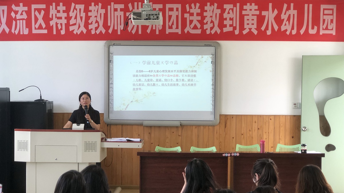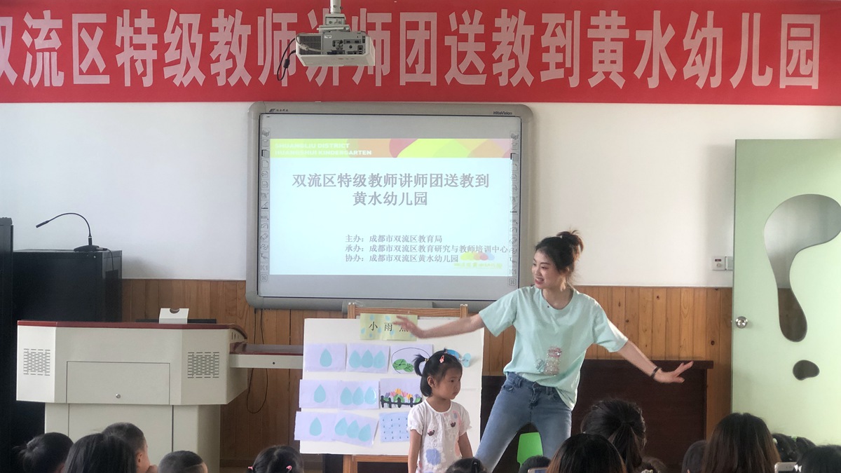 第三场送教活动在黄水幼儿园白云分园举行。这场活动围绕主题“文学活动的组织策略与师幼互动”开展。首先由双流区黄水幼儿园教师朱虹和九江幼儿园教师、双流区巫小芳工作室学员刘柯利分别组织小班语言活动《小雨点》和中班语言展示活动《月亮》。接着在双流区研培中心研培员高永琼主持下进行了评课议课。最后,成都市特级教师、双流区名教师工作室导师巫小芳作了题为《学前儿童文学活动的组织策略》的专题讲座。最后,参会教师就自己在教育教学工作中的困惑同送教的专家进行了积极地互动交流。