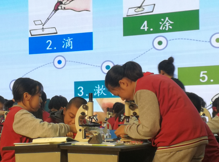 首先是王聪老师以实验教学中注重学生规范操作,尊重科学事实的理念,将“观察动植物细胞结构”这一重要内容借助多种媒体(高清展示台、交互白板等)清晰地呈现了学生们制作临时装片的实验结果,激发了他们对实验和生物学的兴趣,培养了他们的实验探究能力。还巧妙地利用多种动植物细胞结构模式图的比较帮助学生构建了动植物细胞的结构具有统一性和差异性的观点。
