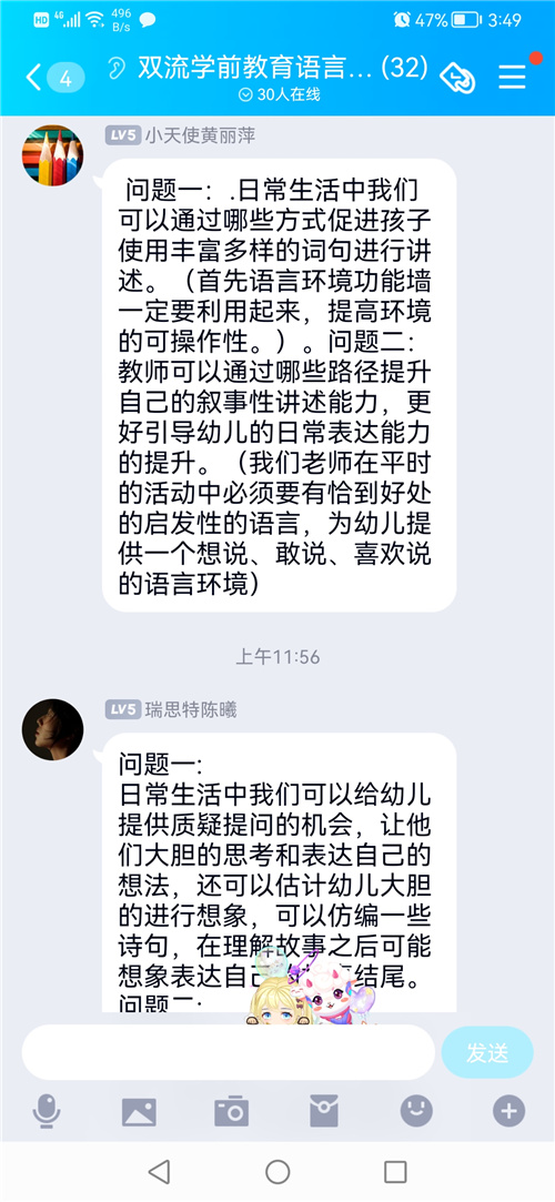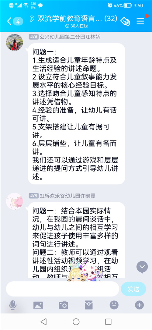 最后,我们通过网络平台进行分组研讨,大家围绕如何丰富幼儿叙事性讲述的语句和怎样促进的教师叙事性讲述能力两个问题展开,大家各抒己见,发表自己的想法,协和幼儿园兰亮老师和西航港幼儿园丁嘉老师代表小组进行了研讨成果的分享,同时语言联组段霁洮组长从搭建支架、有效提问、小结提炼等方面总结了提升幼儿叙事性讲述能力的有效策略。接下来,双流区研培中心学前教研室叶美蓉主任进行总结:做为老师是否为幼儿创设了想说、敢说、愿意说并能及时回应的环境;做为管理者是否思考教研要解决是什么、为什么、怎么做的问题,不断反思幼儿园教研的路径和成效。