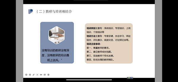 本次专题培训朱老师从园本教研的意义价值,园本教研的内涵,园本教研的组织与实施以及实施园本教研应注意的问题四方面进行了深入浅出的讲解,为我们带来了一场学术盛宴。