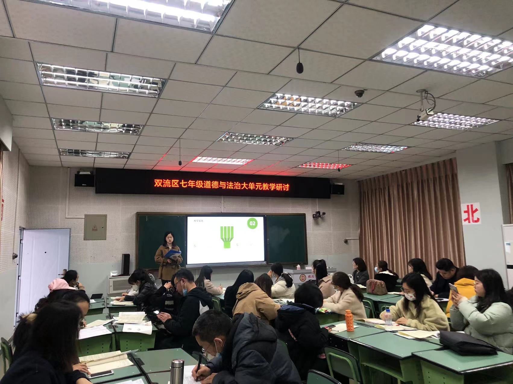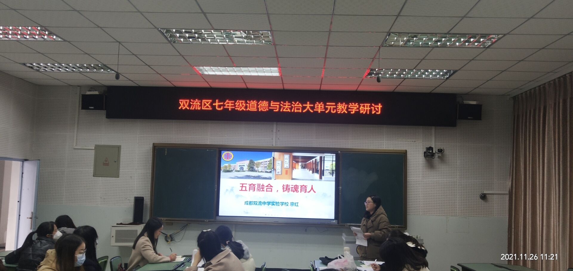 2021年11月26日上午9:00,双流区七年级道德与法治教学教研活动在双流中学实验学校举行,本次活动分为三个部分:首先由双中实验校熊梓羽老师带来一堂《生命的意义》大单元教学展示课;其次熊老师说课,教研员杜梅老师组织评课;最后由双中实验校廖红老师带来《五育融合,铸魂育人》讲座。