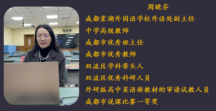 成都棠湖外国语学校外语处副主任周晓芬老师带来了以“寄语双流高中英语青年教师”为主题的分享。她首先从个人的成长的经历讲起,指出“有意义的事业,师劳而生逸;成才时间,不容等待”,鼓励各位青年教师积极奋斗,力争做到“一年入行,两年成熟,三年成才”;然后又从“棠外修身教育与个人发展”和“我们的做法与我们的成长”两个方面对成都棠湖外国语学校的英语教研活动和英语教师的专业成长进行了细致的分享。