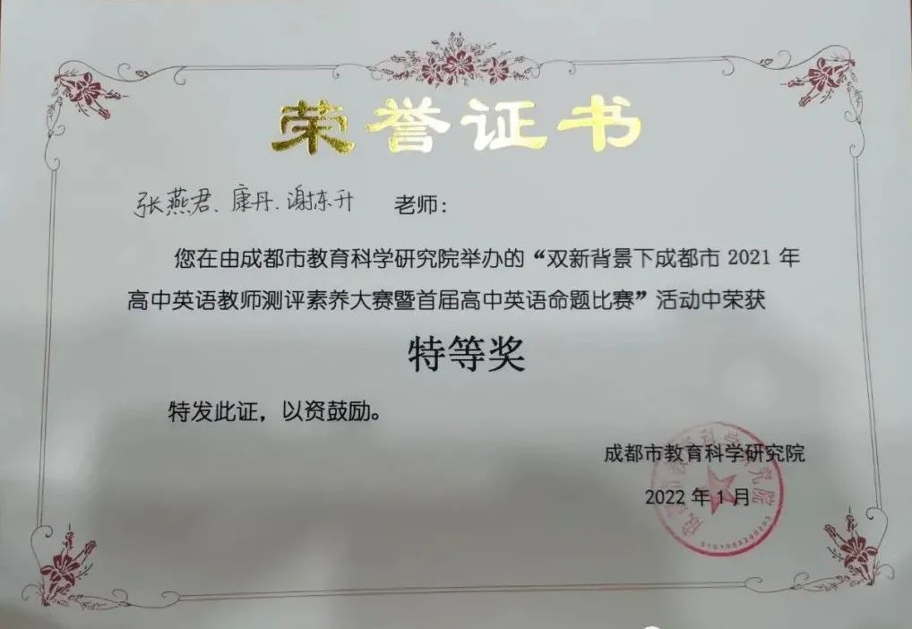 此前,成都市教科院面向全市高中英语教师开放,近百所学校的近百支团队400名左右老师积极投稿参赛,经过严格选拔,十三所学校脱颖而出。今日,来自成都市十三所高中的代表队汇聚成都市教科院,进行现场限时命题决赛,经过一番激烈的角逐,双流区棠湖中学代表队位居第二,荣获特等奖!这支优秀的团队由组员张燕君、康丹、谢东升老师,指导教师李鹏老师组成。