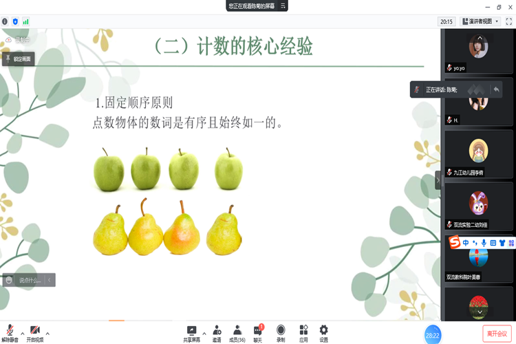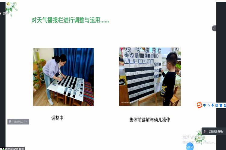 接着,陈小青老师对数概念在一日生活中的渗透价值、班级的自主实践进行了分享,并以天气预报为例,详细介绍了教师在实践和渗透中的反思与启示。