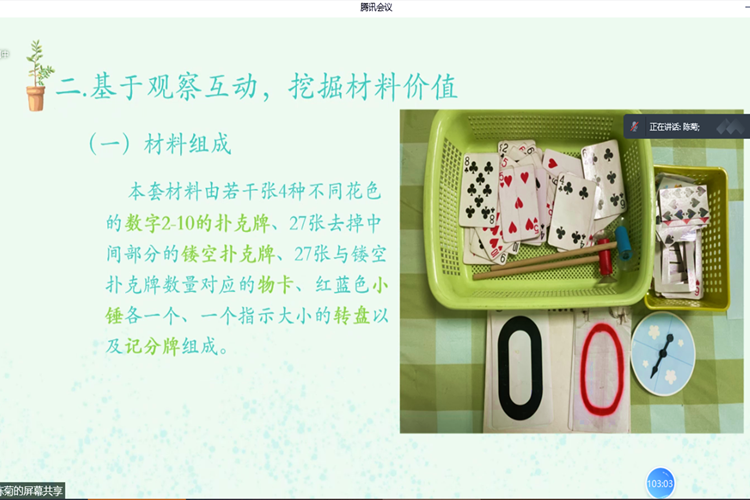随后,杨欢老师带来了数概念个别化材料《趣玩扑克牌》的探究过程,杨老师基于个别化游戏材料的教育价值,分享了在教师的支持下,幼儿在趣玩扑克牌的过程中进行玩法探究、数概念经验巩固提升的过程,突显了站在儿童立场进行材料设计与投放的重要性。