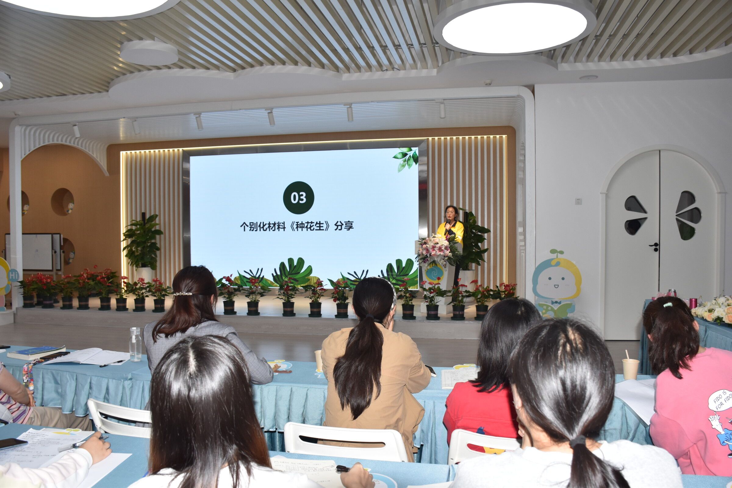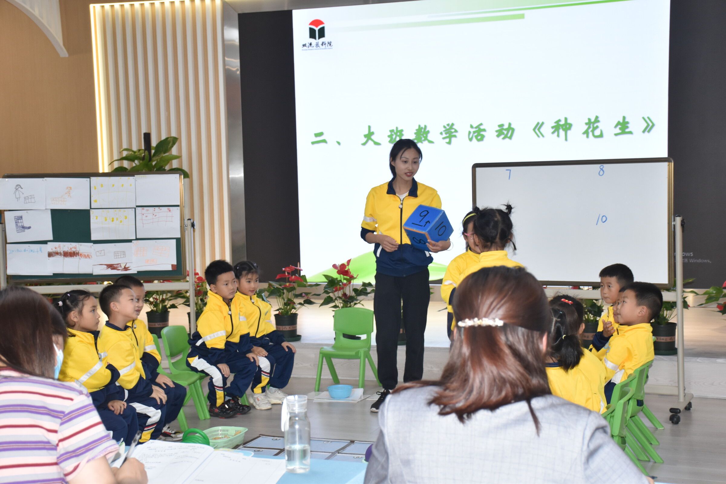 随后,协和幼儿园张琴辉老师为大家带来了大班数学活动《种花生》,活动中张老师着重强调问题情景中数字之间的关系,通过情景将问题形象化,同时使用操作物(实物)、游戏等多种方式帮助幼儿去寻找答案,让幼儿感知一定数量的物体(整体)可以分解成几个相等或不等的部分,这几个部分又可以组合成一个整体。本次活动凸显了幼儿的游戏智慧,游戏智慧反映了幼儿思维的灵活性和变通性。活动结束后,张老师针对自己的活动进行了现场说课与反思。