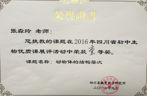 张淼玲老师在2016年省初中生物优质课展评活动中获省一等奖