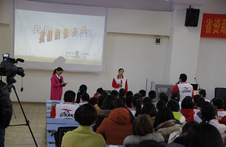 活动中,都江堰市塔子坝中学初二班主任王丽鸳老师做修身班会课的示范教学。王老师在学习了棠外的修身班会课后,在都江堰率先开展修身班会课教育实践,其班级在班风、学风,以及学生成绩方面均取得了显著的成效。