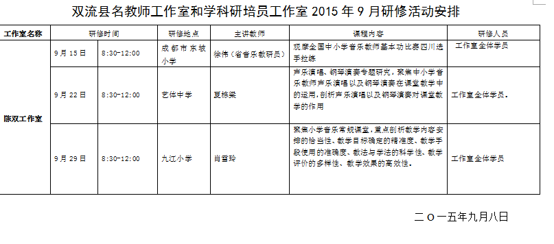 双流县名教师工作室和学科研培员工作室2015年9月研修活动安排_陈双工作室_双流名师工作室