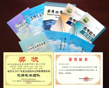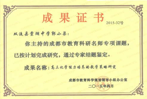 工作室向市教研室申报了《高三化学能力培养的教训策略研究》研究课题。由双流县名师郭小渠工作室承担的成都市教育科研名师课题《高三化学能力培养的教学策略研究》,以优化高三化学复习教学策略,提高高三学生化学学习能力为目标,用当代“大数据”思想和方法,研究近五年的百余套高考试题,对其进行拆分,重整和建模,用统计的方法分析考试的知识、能力范围及重点,热点。该研究工作量大、难度高,研究团队以严谨、细致的态度,经过三年的艰辛努力,完成了这一工作,成果丰富,可信度高,实用性强,为高三化学教师进行复习教学提供了可靠的依据和三维(学习内容,练习难度,时间运用)适切的教学策略,具有推广价值。并且值得祝贺的是该课题已于2015年4月顺利通过结题鉴定,这一成绩将郭小渠工作室导师及成员们的工作推向了新的高度。